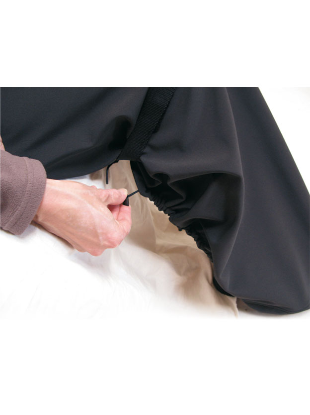 Caliente, impermeable, transpirable y cortaviento. correa ajustable en la cintura cerrada con clip y lo suficientemente larga para rodear la silla de ruedas. Fijado con tiras autoadherentes debajo de las rodillas o en los tubos de la silla, sujeto bajo los pies y ajustable con cordón de ajuste.
