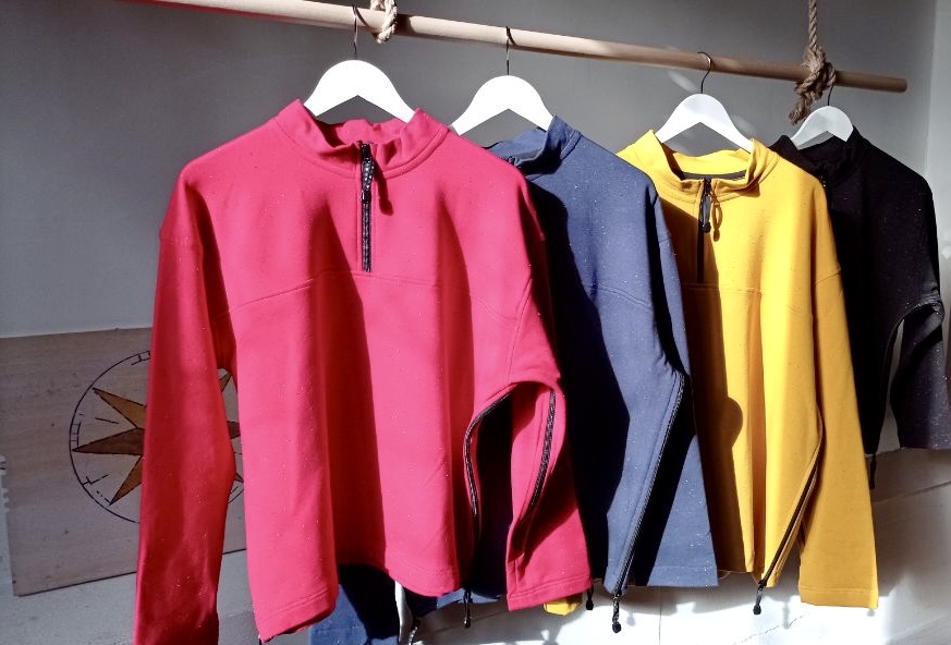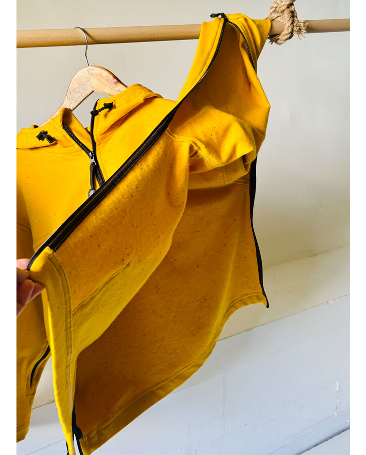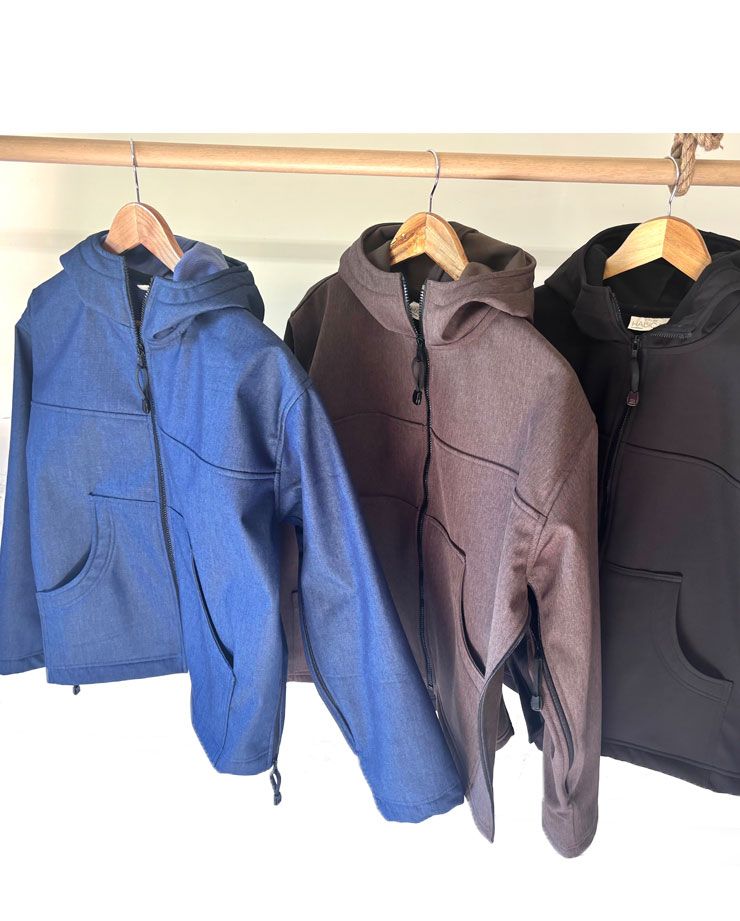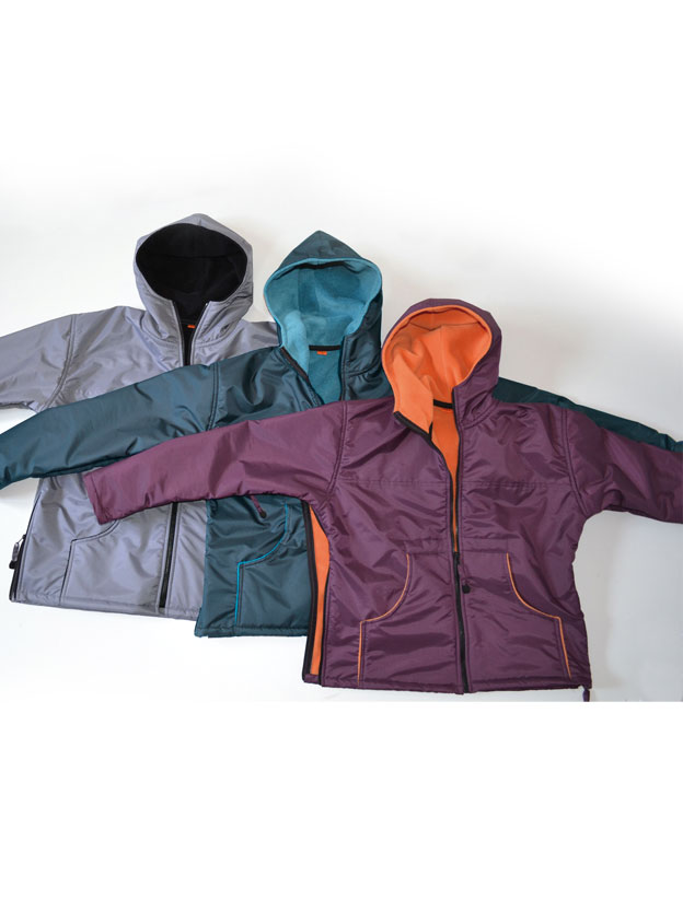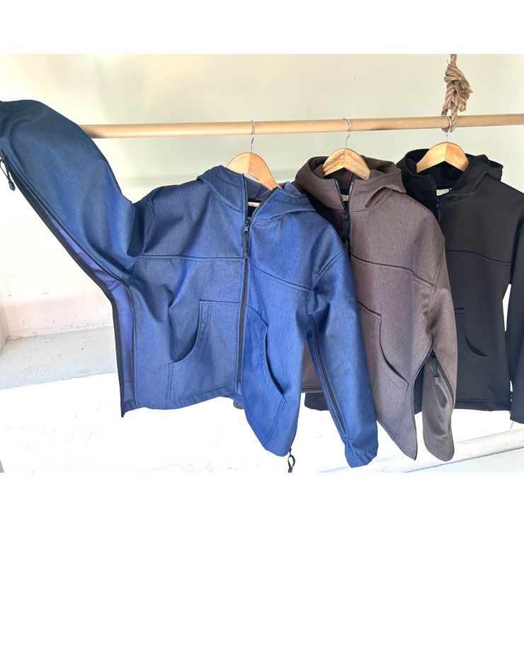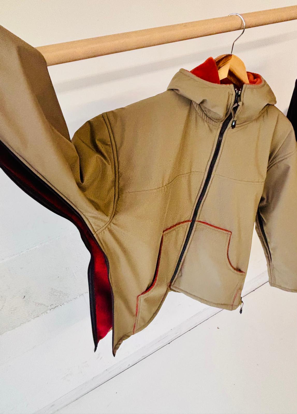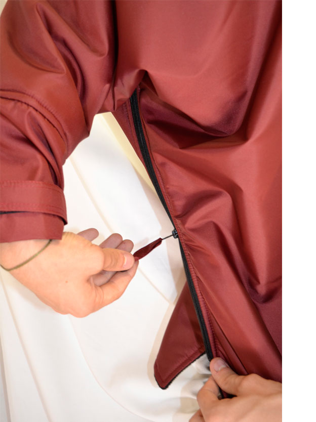 Impermeable, cortaviento, forrado en algodón chambray. Mangas murciélago, completamente con cremallera bajo los brazos (facilidad para vestirse), espalda más corta, puños cerrados con tiras...