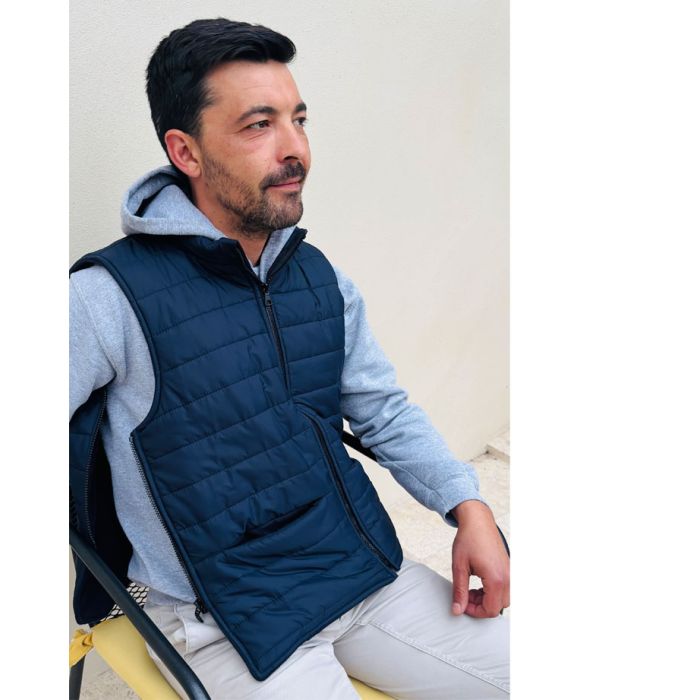Chaleco acolchado sin mangas disponible en 2 versiones: forro polar o forro de algodón. Apertura completa bajo los brazos para facilitar el vestir, 2 bolsillos grandes. 100 % poliéster.